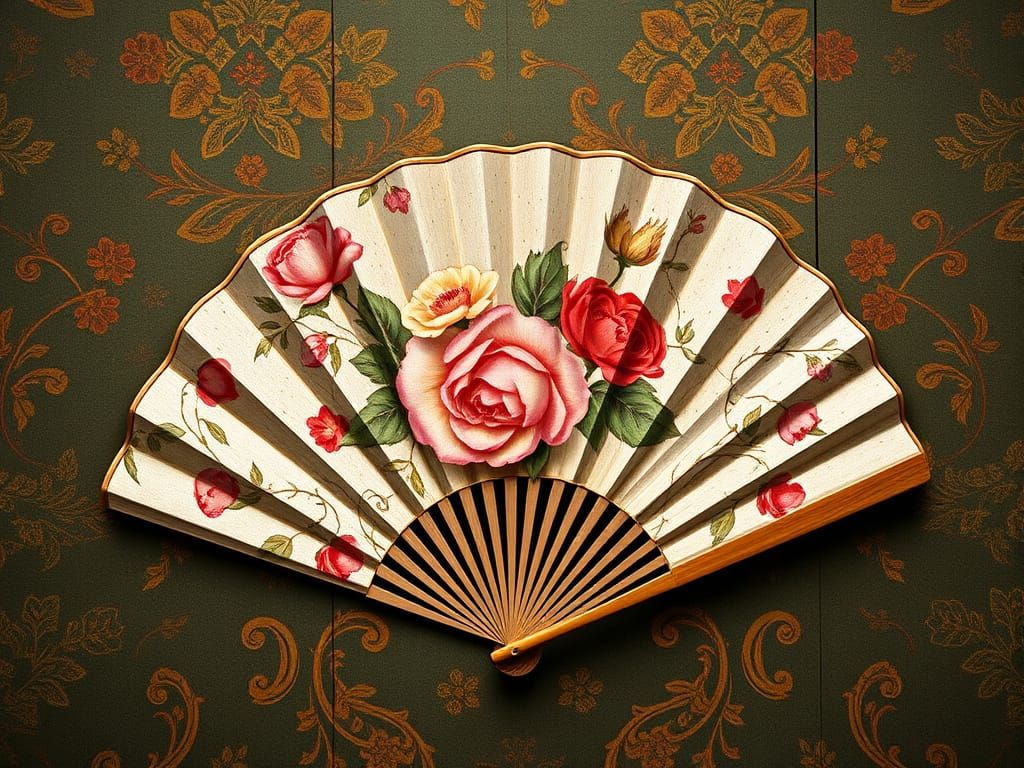 This image is a beautiful watercolor painting of a vintage hand fan with intricate floral designs, showcasing delicate brushstrokes and soft colors.
