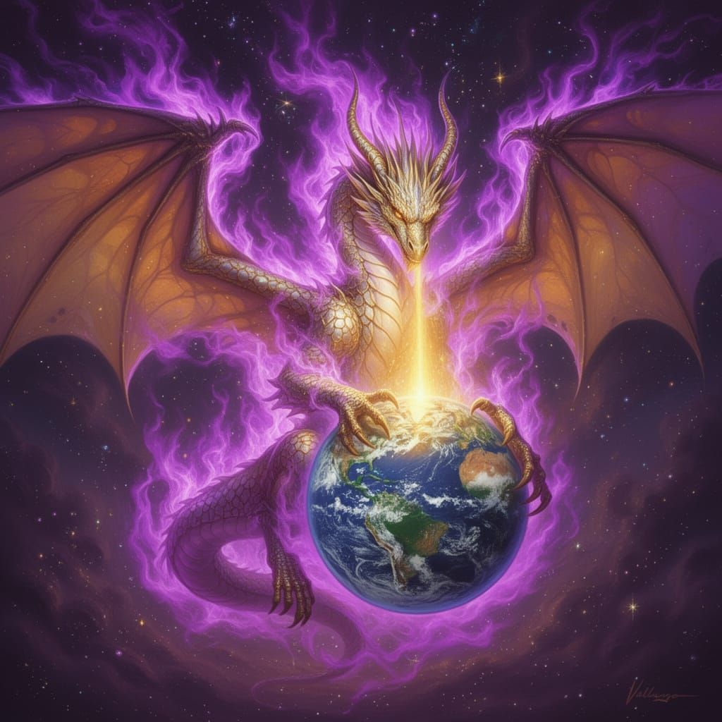 This surreal digital painting depicts a majestic golden and silver dragon, radiating a purple flame of purification and bestowing peace upon the Earth with a gentle golden glow. The art features luminous colors and dramatic lighting.