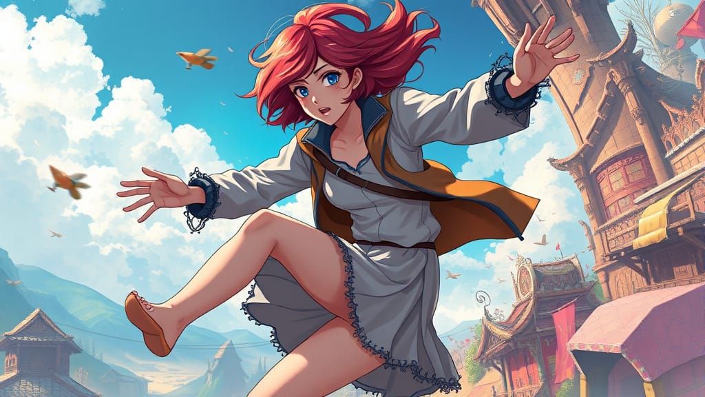 This image showcases a woman with freckled hair in a fantastical setting, blending the detailed anime styles of Wlop, Rossdraws, and Ilya Kuvshinov with vibrant colors and intricate details, reminiscent of high-end fantasy concept art.