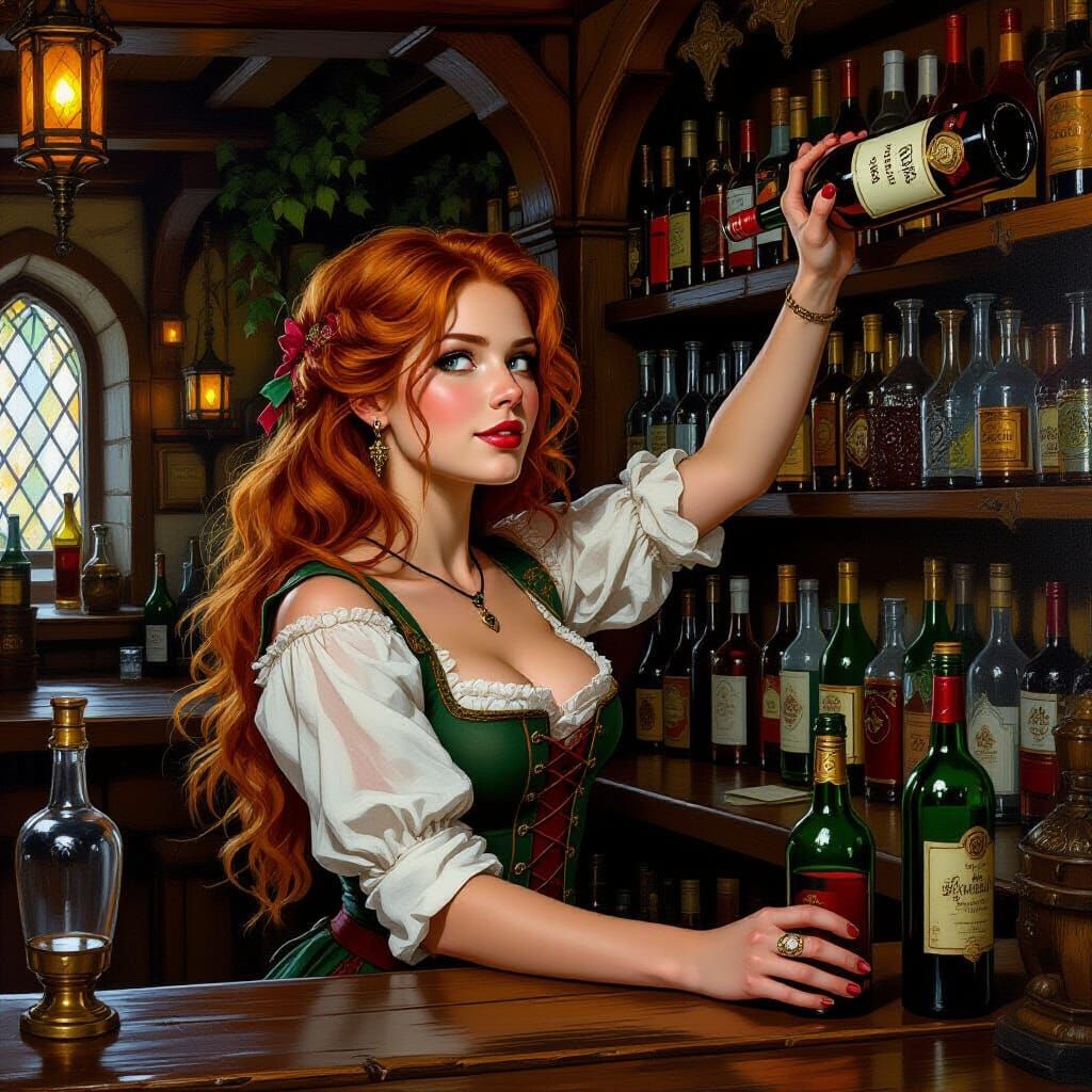 This image shows a redheaded barmaid in a fantasy tavern. She's reaching for a bottle on the back shelf, depicted in a highly detailed fantasy oil painting style.