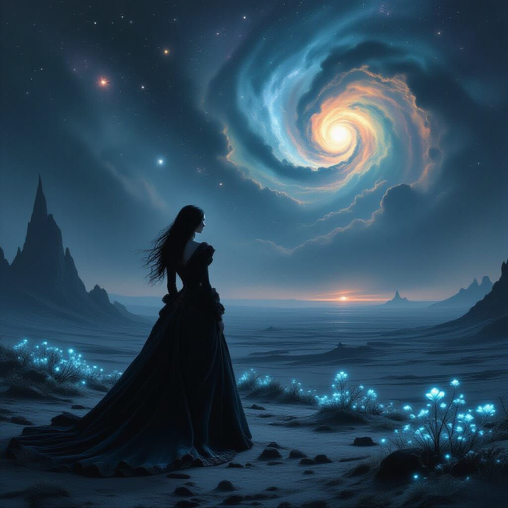 A striking picture of a woman in a Victorian gothic dress standing on an alien planet. Bioluminescent plants surround her under a starry sky in a dark fantasy scene, inspired by surrealist painting.