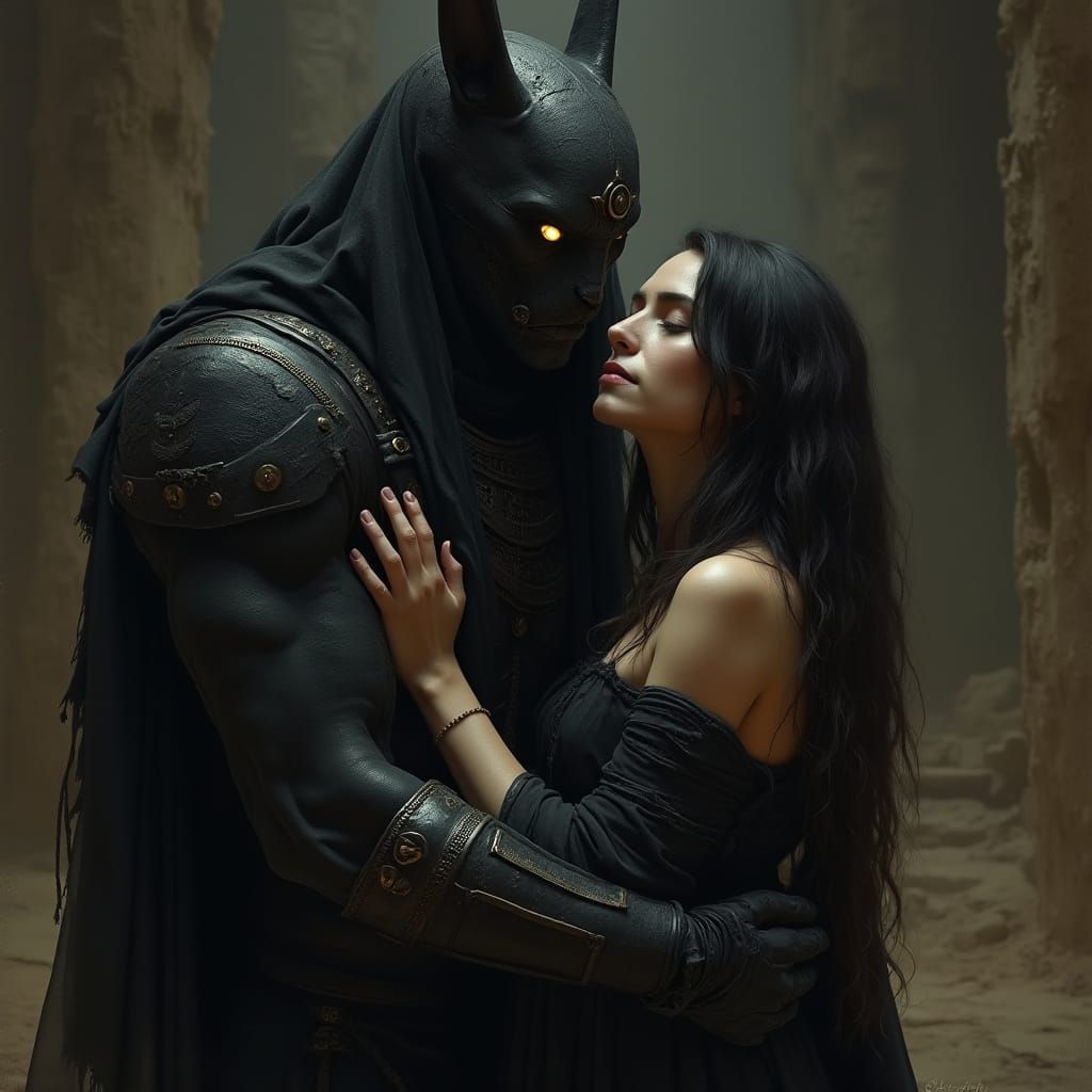 This image shows Anubis in tattered robes embracing a loved one against a mystical Egyptian backdrop, rendered with dramatic lighting and a dark fantasy aesthetic.