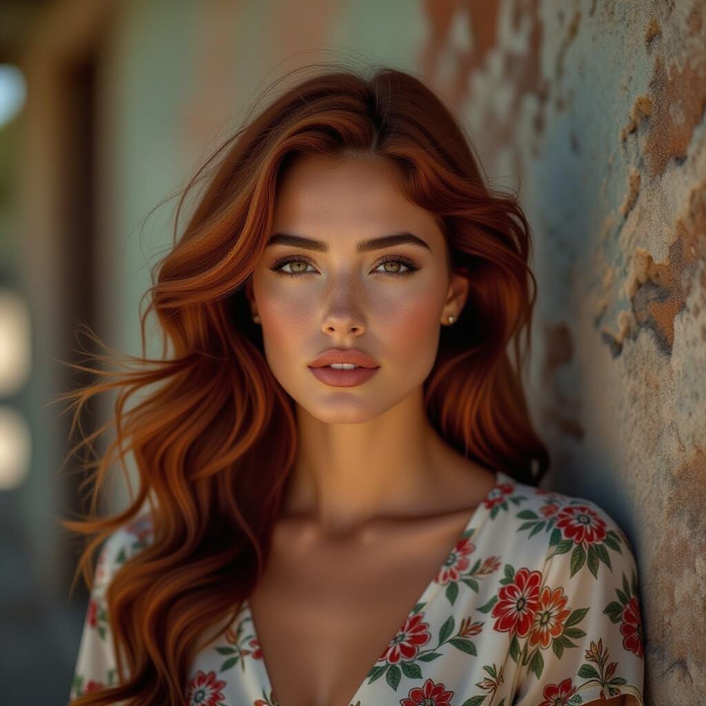 This image shows a woman with auburn hair in a rustic setting, wind swirling around her. The artwork blends Chicano art's vibrancy with elements of Romanticism and Feminist art, reminiscent of classic cinematic film.