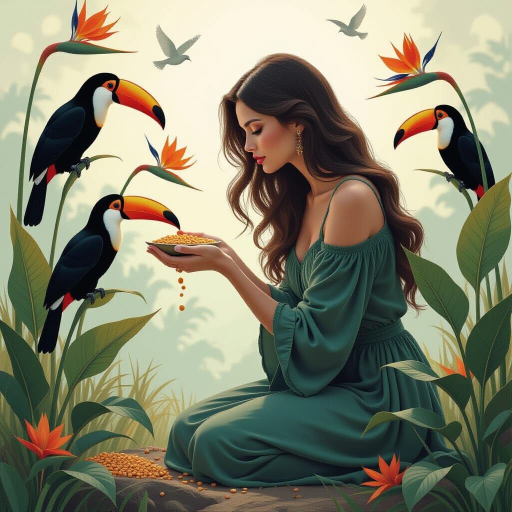 A striking picture of a woman kneeling among Strelitzia plants and feeding toucans. Ethereal bio-art elements create a dreamlike atmosphere with intricate textures and layered designs, in a surreal style.