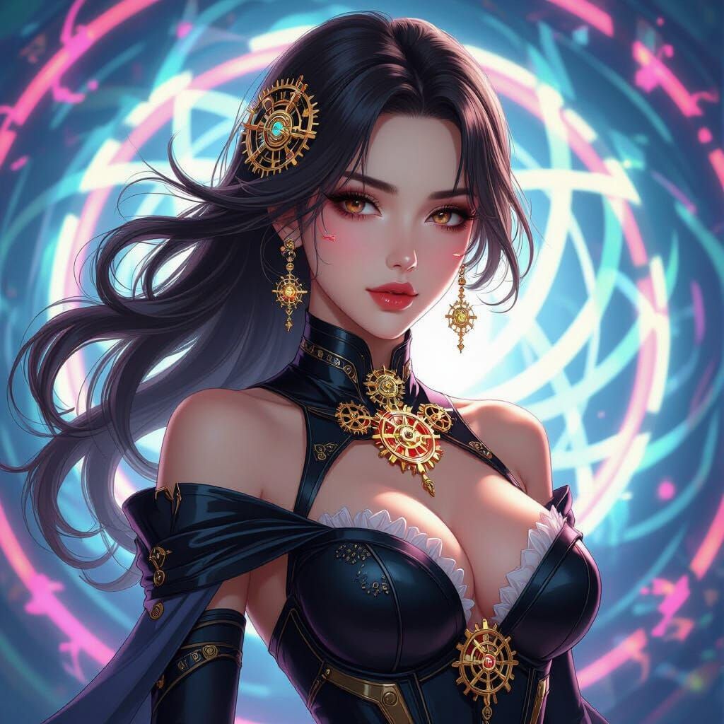 This image shows a stunning woman with clockwork gears and neon symbols on her face. She is set against a psychedelic backdrop in a hyperrealistic anime style. The image features vibrant colors and intricate details.