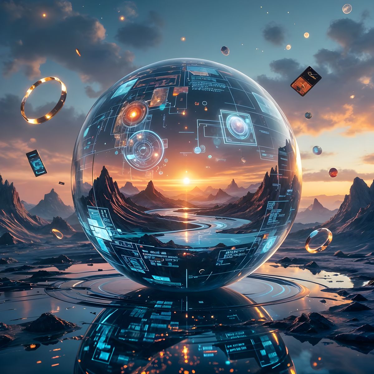 This image shows a hyperrealistic, semi-transparent sphere in a multidimensional dreamscape, rippling with data and refracting light. It contains swirling memory fragments and holographic glyphs, with orbiting symbols of fragmented time.