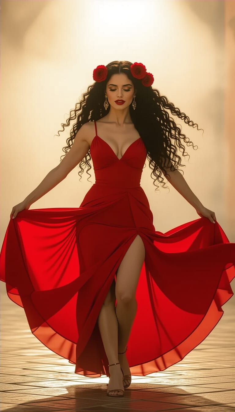 A captivating image of a Spanish woman dancing with joy. Her long, curly black hair is adorned with red roses, and she wears a flowing red dress. This cinematic shot has a warm, nostalgic film grain.