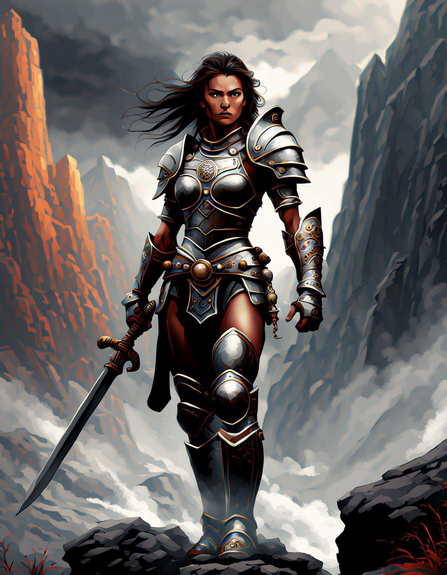 This digital painting showcases a determined female warrior in gleaming, detailed armor. The artwork features a rugged mountain landscape under a stormy sky, rendered with dramatic lighting and deep colors.