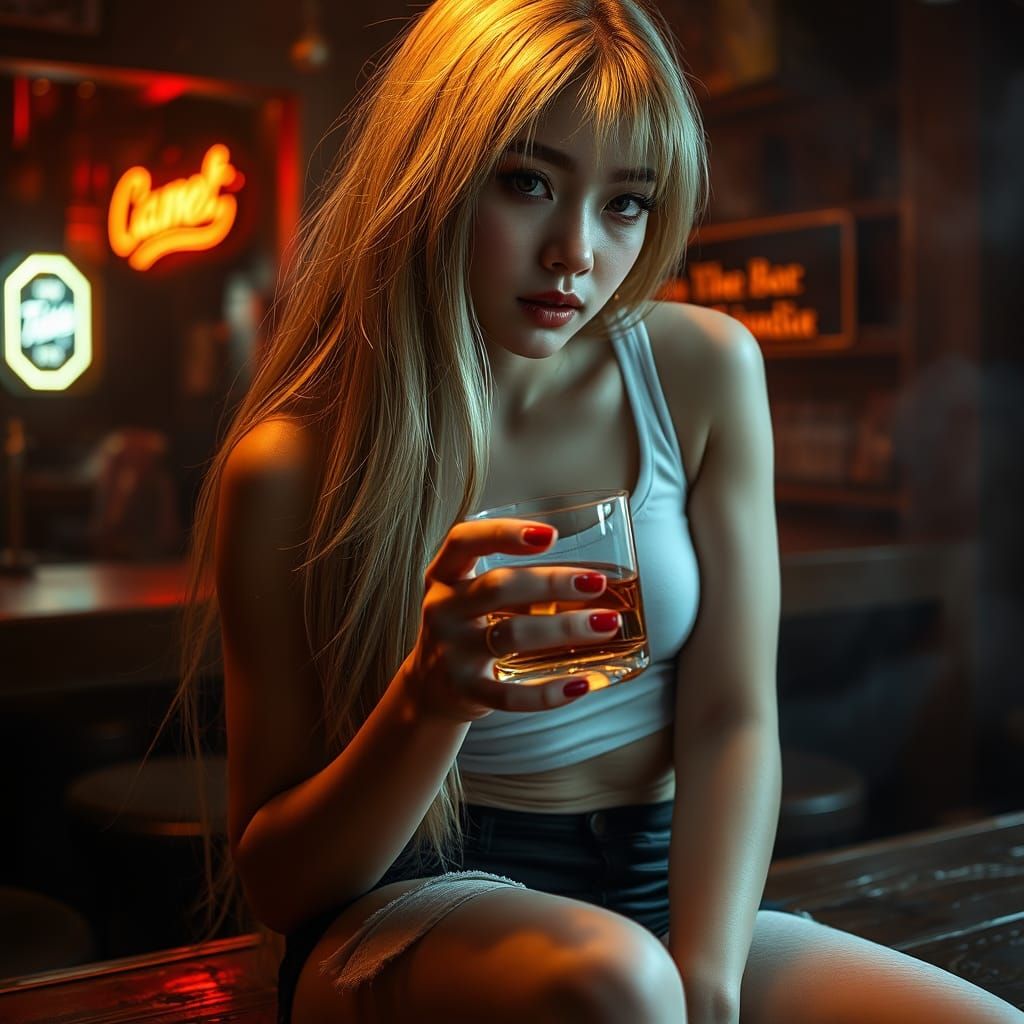 A woman sits in a dimly lit bar, illuminated by a lone neon sign, with a whiskey glass in hand and a subtle sheen of sweat on her porcelain-like skin. Her golden blonde hair cascades down her back, and she wears a fitted tank top, distressed shorts, and fishnet stockings, with a confident and edgy demean...