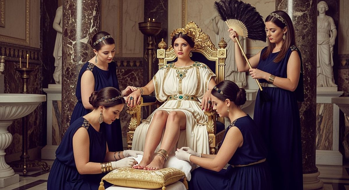 This image depicts a Roman Empress regally posed on a golden throne. Servants attend to her in a luxurious palace bathroom with marble and statues, illuminated by natural light and soft bokeh.