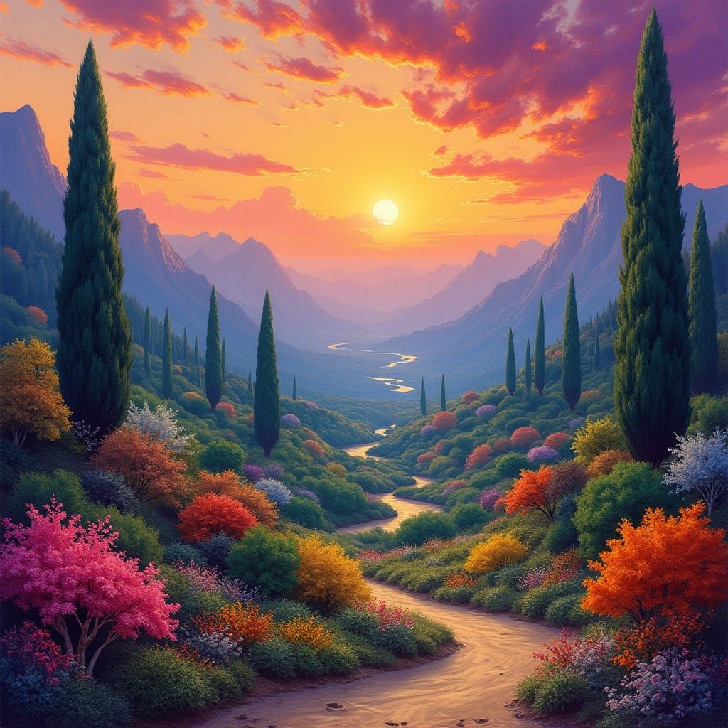 A vibrant, cubist landscape reminiscent of the Renaissance period. The matte painting features bold colors and intricate textures, evoking fantasy concept art as 3D rendered digital art.