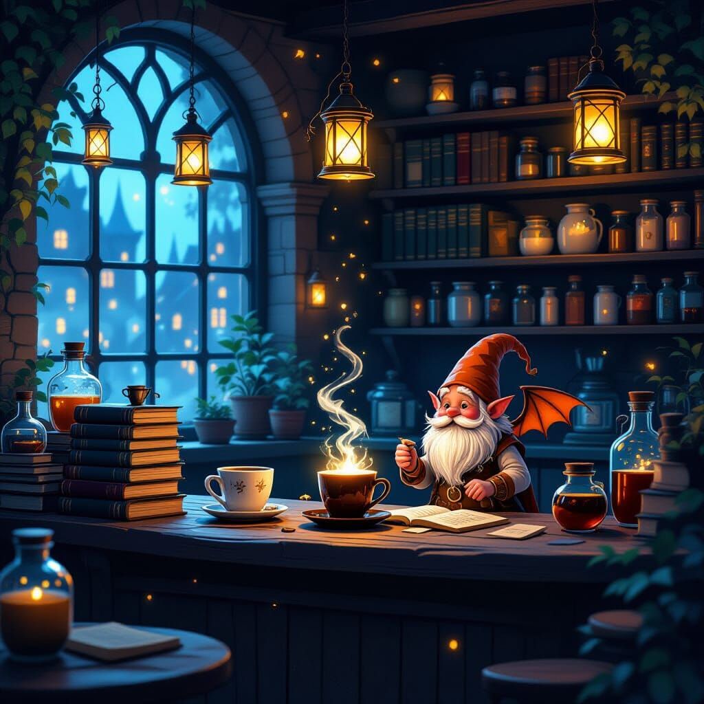 A cozy, dimly lit café interior where the coffee mugs themselves emit a soft, magical glow, illuminating the spellbooks and potion bottles stacked on the counter. Floating lanterns drift lazily through the air, casting dancing shadows. A mystical creature, perhaps a small dragon or a gnome, is seen serving ...
