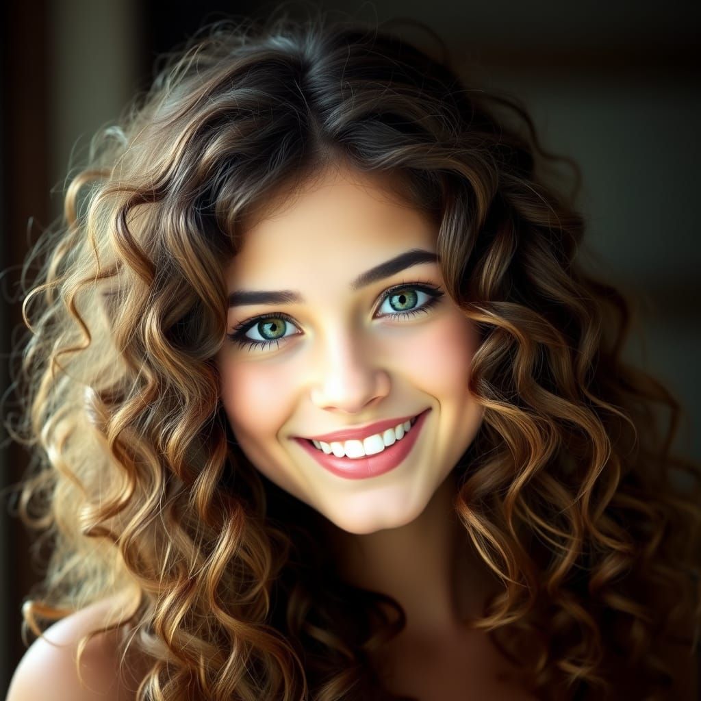 This image shows a portrait of a beautiful young woman with long, curly brown hair and a radiant smile. Her bright eyes add to her captivating appearance.
