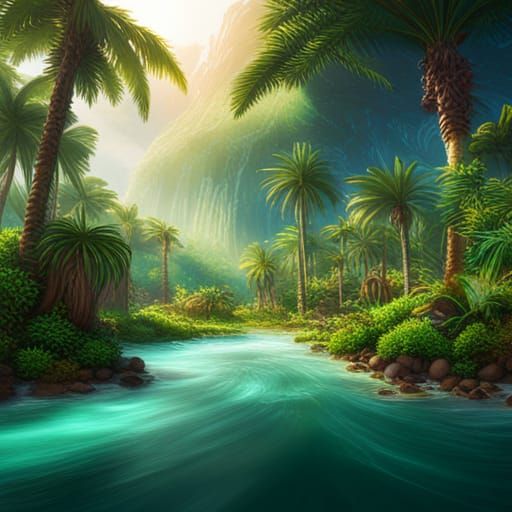 A vibrant image of a coral beach surrounded by a lush palm tree forest. The scene is rendered with intricate detail, deep colors, and a fantastical aesthetic, in a detailed matte painting style.