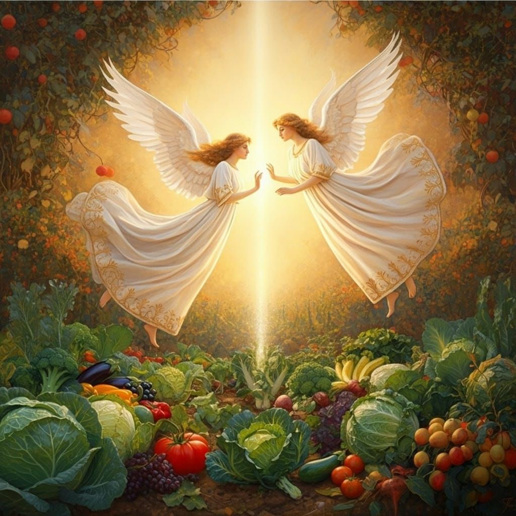 This enchanting image depicts ethereal angels in flowing white robes with delicate wings, flying above a lush garden filled with colorful vegetables and fruits. Soft, warm light bathes the scene, as the angels' outstretched hands radiate gentle, pulsing beams of nurturing energy, promoting growth and vit...