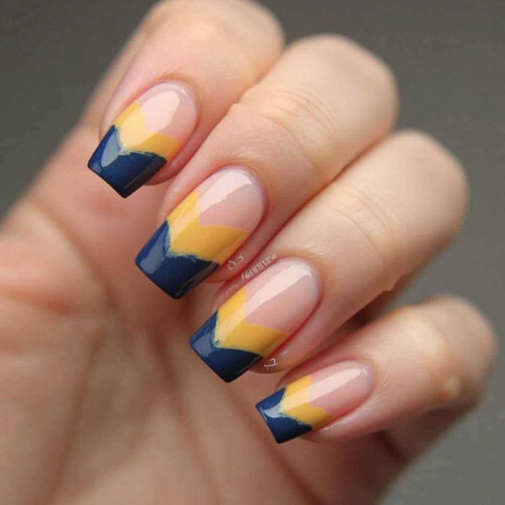 This image shows an elegant woman's hand with French tip nails in alternating navy blue and yellow. The design has a bold and playful aesthetic, as 3d rendered digital art.