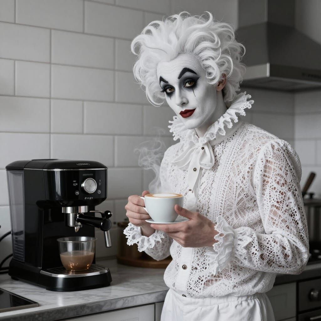 This hyperrealistic image shows Pierrot in a white lace shirt holding a steaming cappuccino in a tiled kitchen. Moody lighting and sharp focus create a cinematic atmosphere.