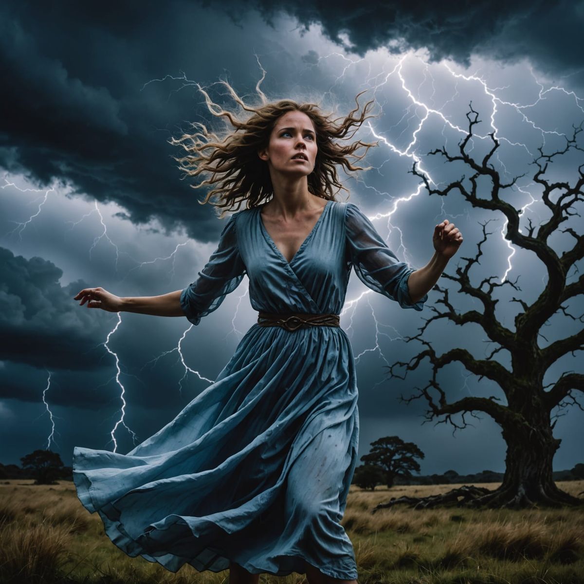 This image shows a woman in a white dress emerging from a storm cloud. Lightning illuminates her and the landscape in an ethereal atmosphere. The image captures a moment of dramatic power.