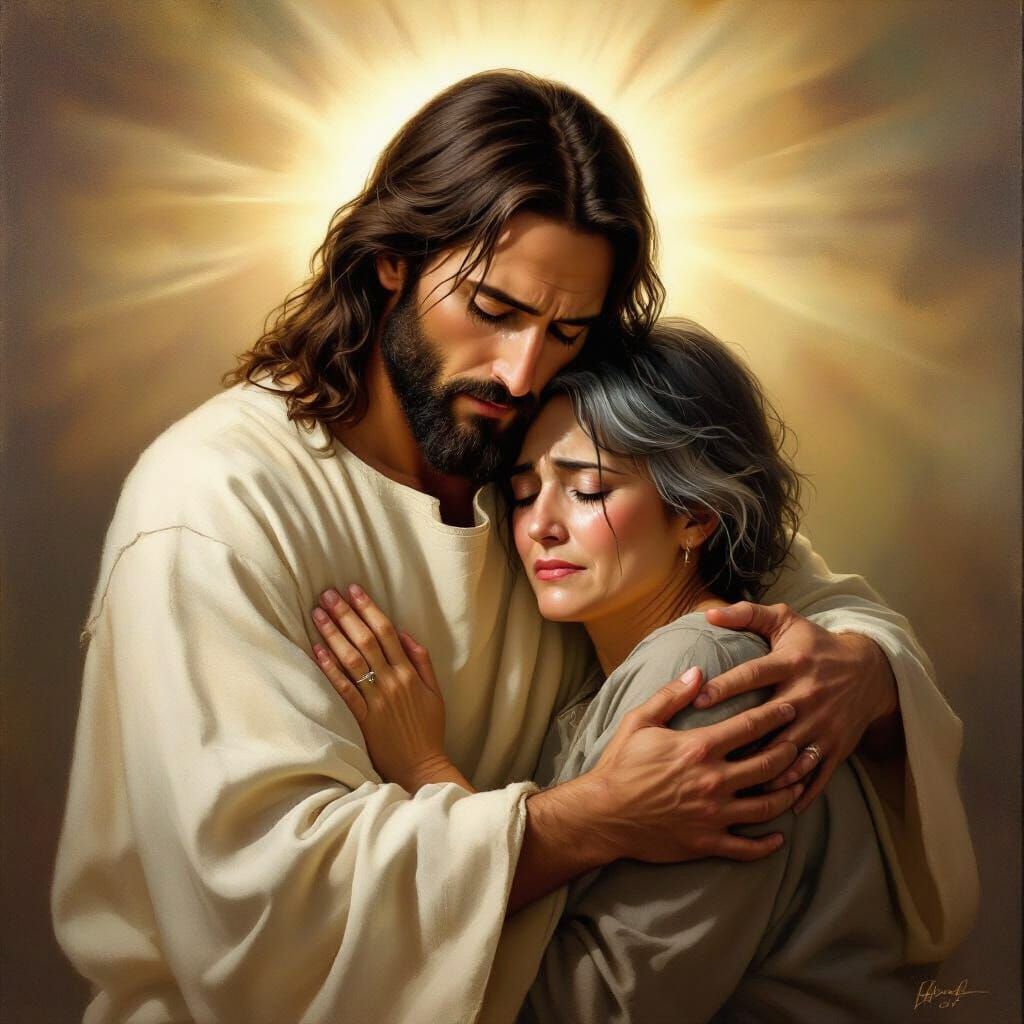 This image shows Jesus Christ tenderly cradling a sorrowful woman, offering divine comfort and peace. Created in the style of a Renaissance oil painting with soft lighting, it evokes profound spiritual healing.