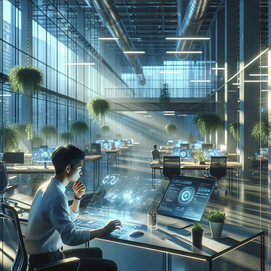 This image shows a young South Asian professional working with holographic interfaces in a minimalist office. The scene blends natural light and blue LEDs for tranquil productivity, emphasizing technology and human focus.