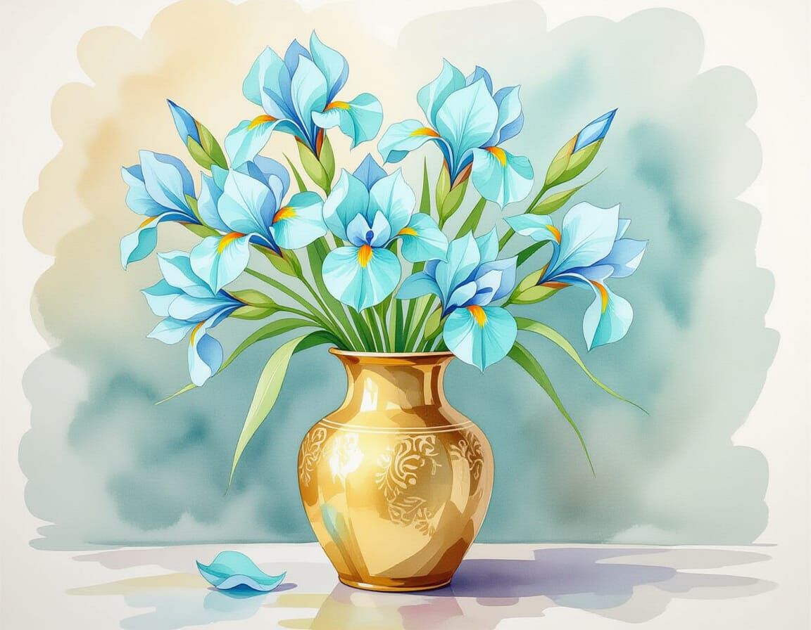 This image shows a watercolor painting of turquoise irises in a vase. The artwork employs a pastel color palette, subtle textures, and delicate details to create a fluid composition.