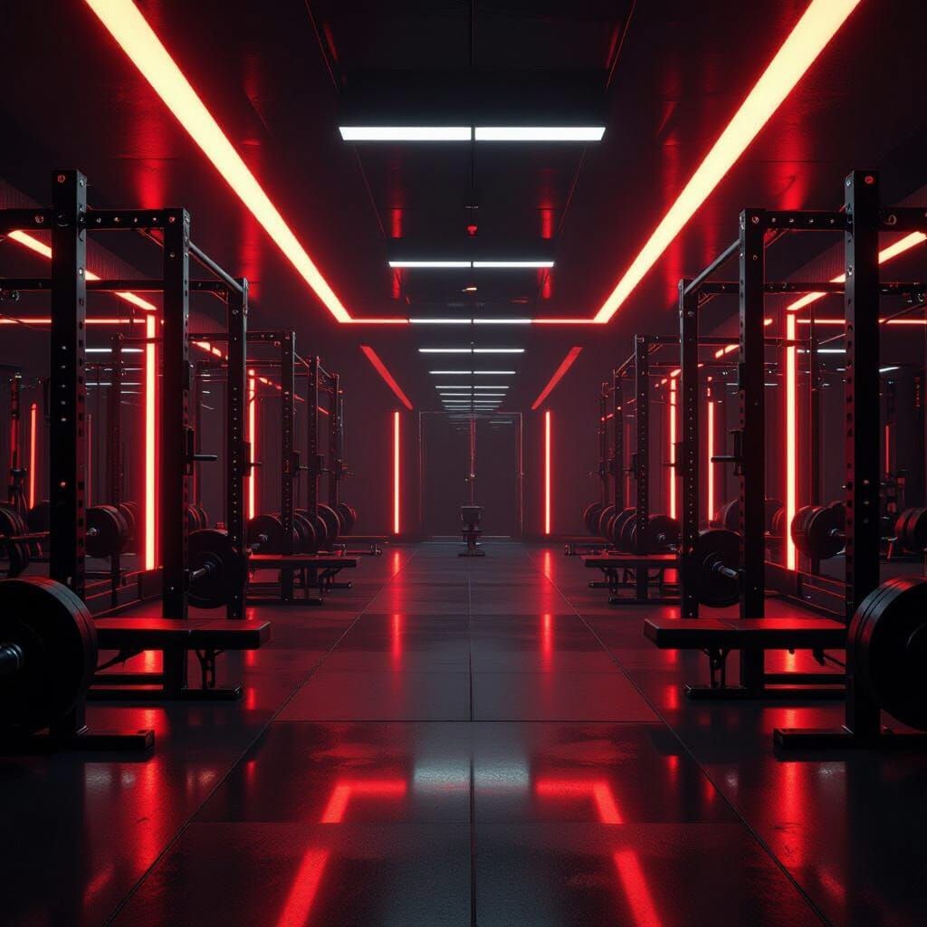 This image shows a futuristic gym interior bathed in dramatic red and black lighting. The scene features rows of heavy equipment, intense shadows, and sleek reflections in a cinematic style.