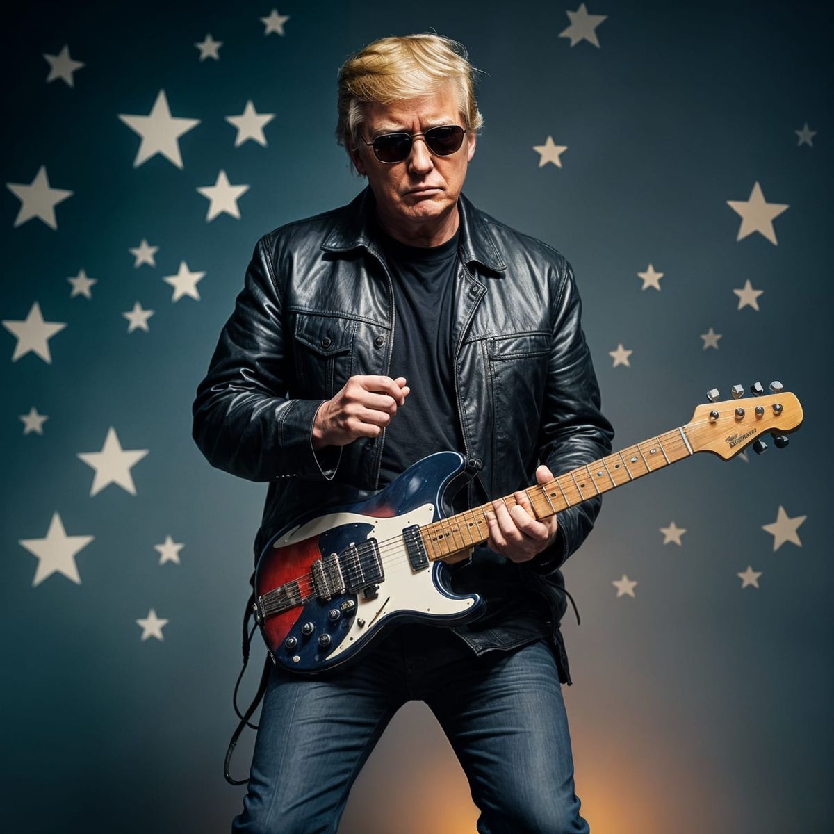 This image captures a striking scene of a politician playing a guitar with a bold, star-spangled design, set against a dramatic, cinematic backdrop.