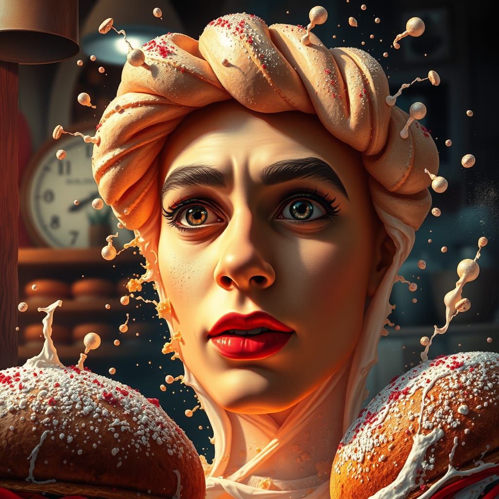 This image depicts a hyperrealistic concept art of a pastry shop revealing an unexpected surprise. It features intricate details, dramatic lighting, and a colorful background, presented in a dynamic splash art style.