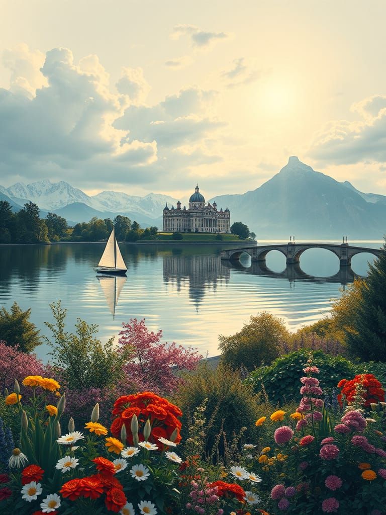 This image depicts a serene landscape with a sailboat on a tranquil lake, a majestic Victorian palace, and vibrant blossoming gardens, set against a soft cloudy sky and majestic ice mountains, in a style blending Van Gogh's Post-Impressionism, Japanese woodblock printing, and digital landscapes.