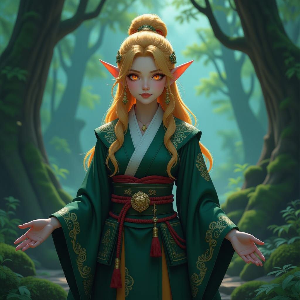 This image shows a detailed matte painting of a gnome cleric and shrine maiden in an ancient forest with kodama. The art features complementary colors and intricate detail, reminiscent of fantasy concept art.
