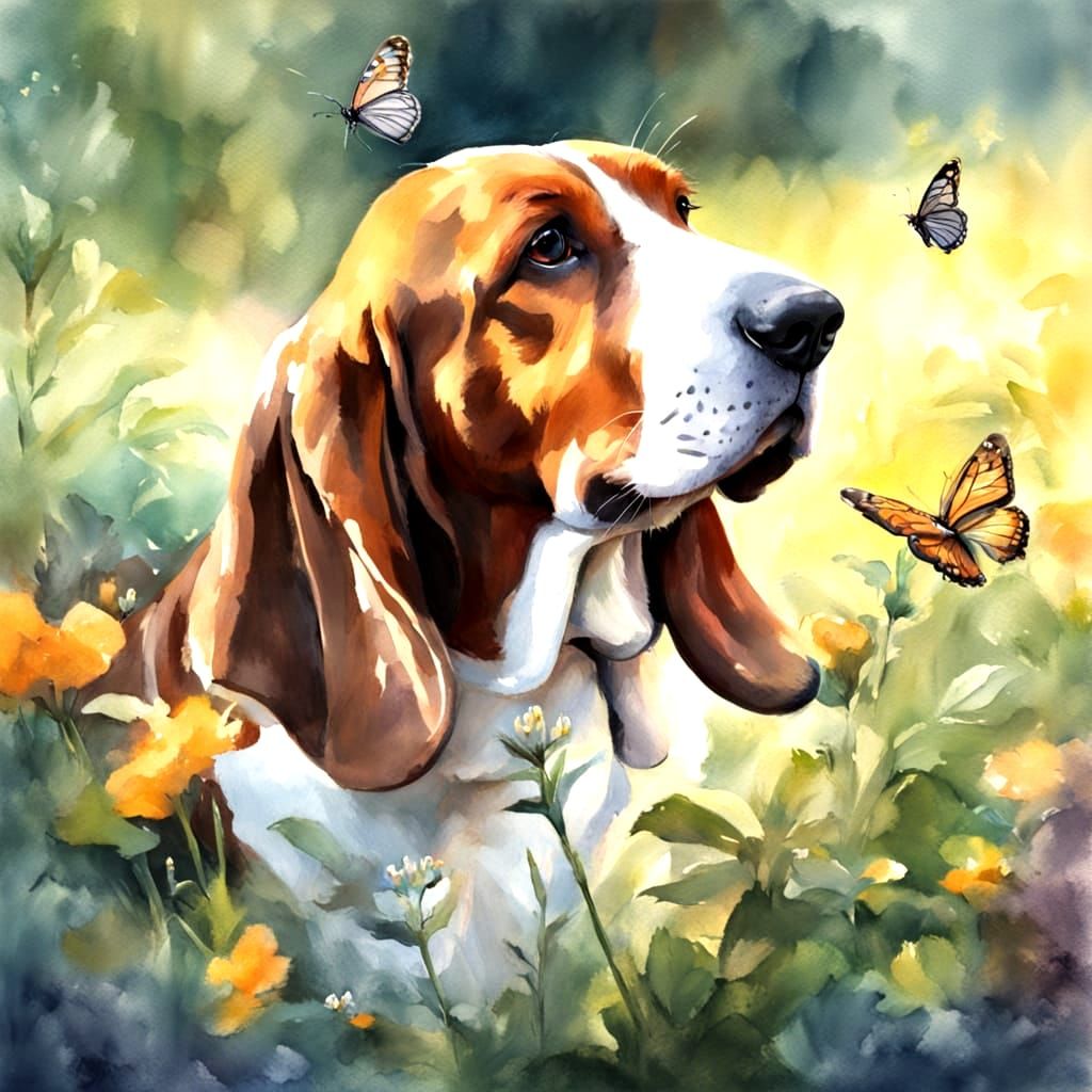 This image shows a Basset Hound joyfully playing with a butterfly in a park. It's rendered as a watercolor painting with visible brush strokes in a playful, impressionistic style.