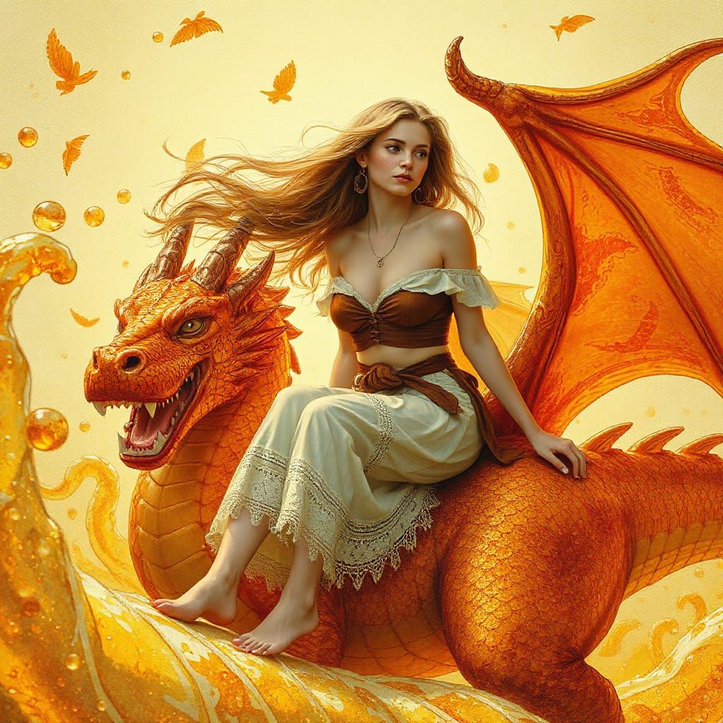 A serene woman with golden hair rides a giant gummy dragon through a surreal sea of soda. The art blends whimsical fantasy, art nouveau curves, and futuristic neon accents.