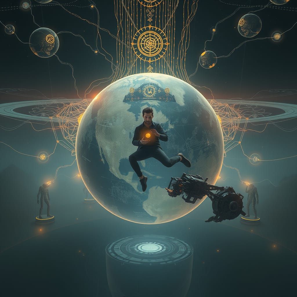 A digital artwork showing a person suspended in a sphere, surrounded by glowing threads and ancient machinery. The scene blends futuristic and mystical elements with soft shadows and liquid light trails.