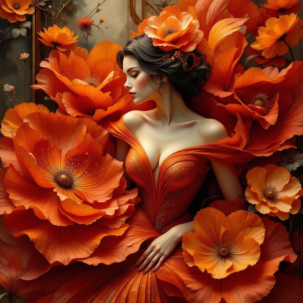 This image depicts a woman in a luxurious haute couture gown made of giant red flower petals with golden veins. It features elegant art nouveau aesthetics, intricate details, and soft sunlight.