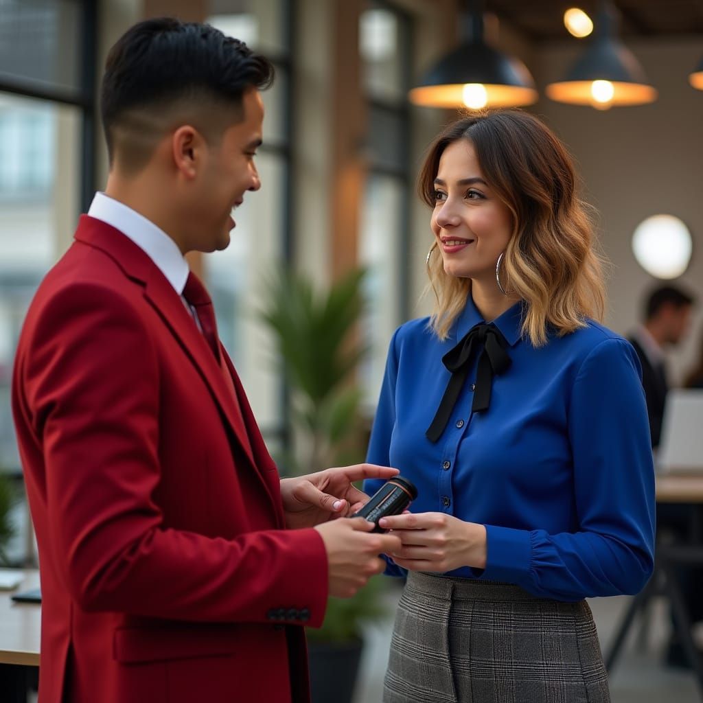 This image captures an ecstatic Indonesian reporter in a red suit handing film to a Slovenian reporter in a vintage office. Professional photography highlights sharp focus and natural lighting.