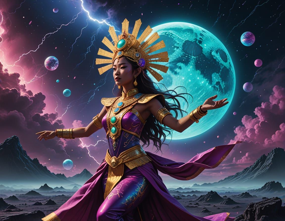 This image depicts a serene Balinese dancer in a traditional golden costume, suspended above the lunar surface in a dreamlike scene. The cosmic background features a vibrant storm with glowing shrine, pulsing symbols, and a radiant landscape.