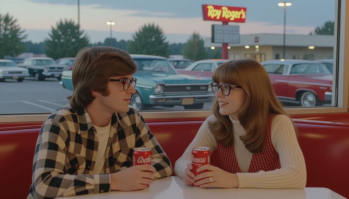 A photorealistic image capturing a nostalgic 1970s scene of a teenage couple sharing Cokes in a restaurant booth. Features period details like sideburns, glasses, and classic cars.
