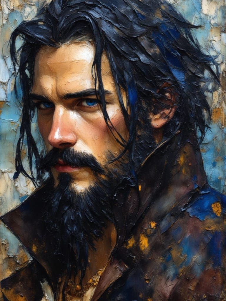A digital encaustic painting of a pirate with a long black beard and textured dreadlocks. The portrait features stippled, scuffed skin, sparkling eyes and cool hues, in the style of Klimt.