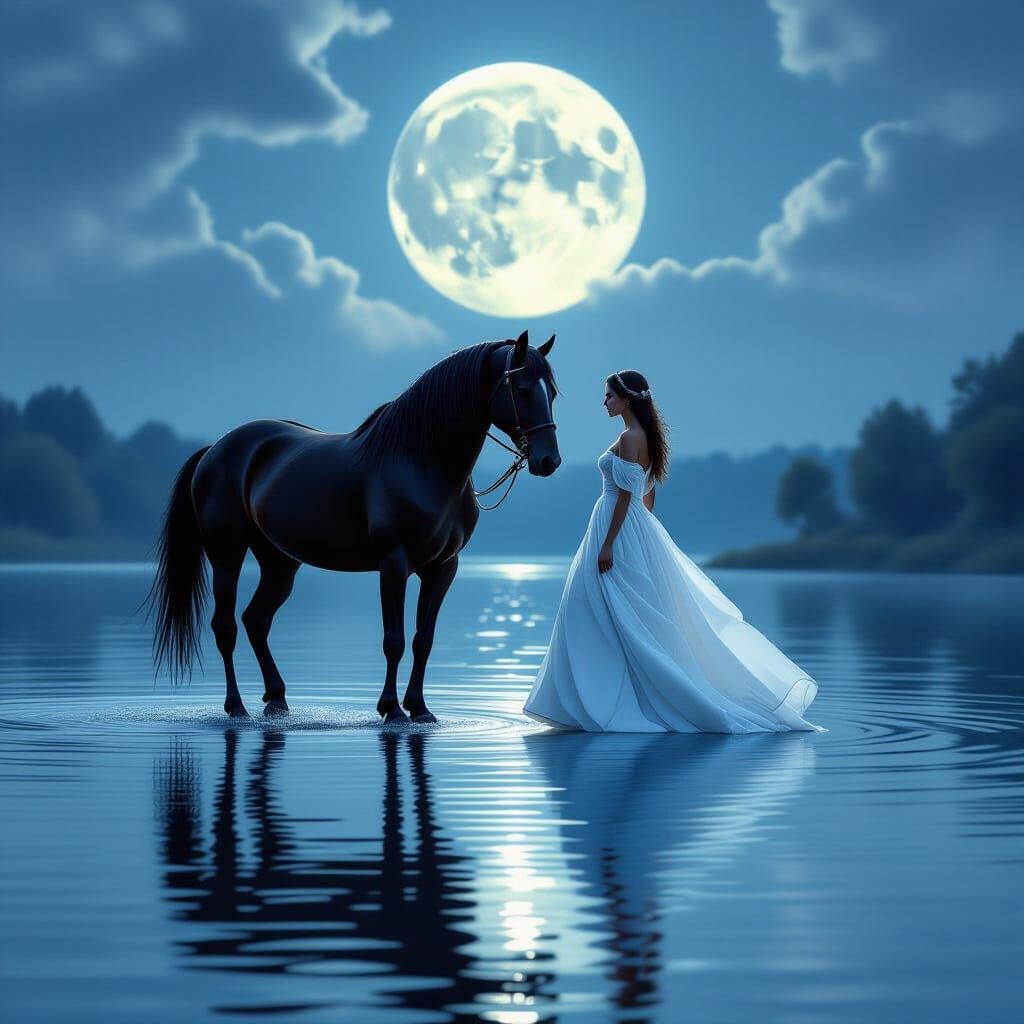 This image shows a woman and a black horse walking on water under moonlight. The photorealistic image has the soft, ethereal quality of digital painting.