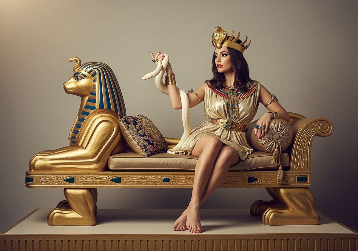 A captivating image of an Egyptian queen in gold attire, reclining on a sphinx-shaped chaise lounge. She holds a white snake in her hand, photographed with a shallow depth of field and natural lighting.