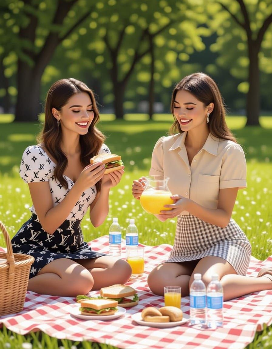 This image depicts two smiling young women having a picnic in a sunlit park, with one holding a sandwich and the other pouring lemonade. Rendered in a photorealistic style.