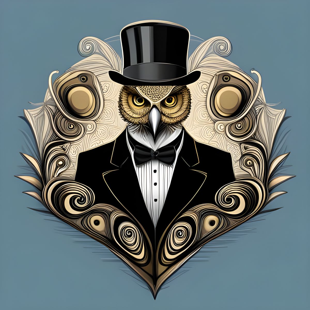 This image shows a gilded owl in black and gold, wearing a monocle, hat, and tuxedo. The artwork features abstract vector fractal elements and 3D shading in a Zentangle style.