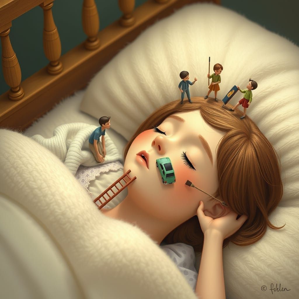 This image shows a sleeping woman attended by miniature figures performing surreal tasks. The scene evokes fantastical imagery with dreamlike qualities, resembling a blend of whimsical animation and meticulously detailed illustration.