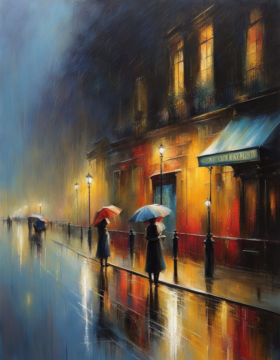 This image shows a dreamy, moonlit London street scene painted in vibrant, expressive dry brush oils. The artwork combines the city's mystical atmosphere with the artist's unique style, creating a captivating visual experience.