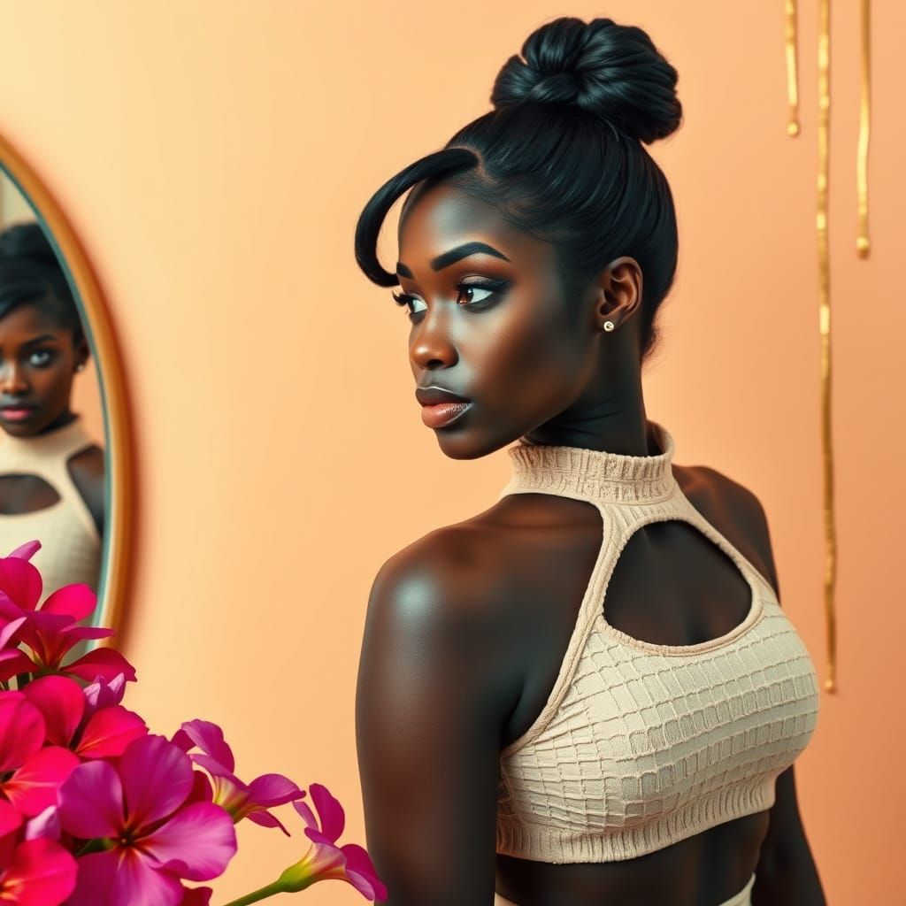 This image shows a vibrant, photorealistic photograph of a woman with dark skin and hair. She wears a textured cream top and is reflected in a mirror, with pink and red flowers and gold drips in the background.