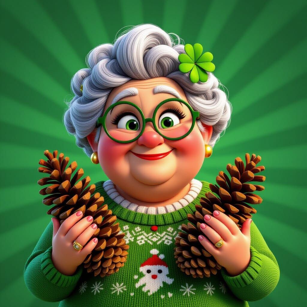 This image shows a cheerful, plump grandmother with green eyes, holding fir cones. She wears a green knitted dress with a Christmas theme and a clover in her hair, set against a bright gradient background. Rendered in a Pixar-inspired 3D digital art style.