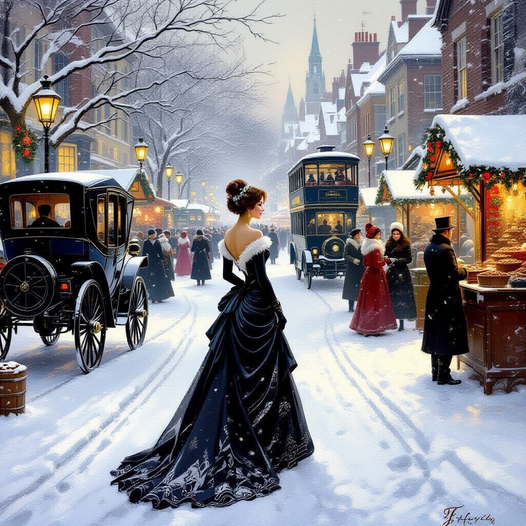 A beautiful woman in an elegant evening dress in a bustling Victorian winter street. Oil painting captures the festive Christmas spirit with carriages, snow, and warm light.