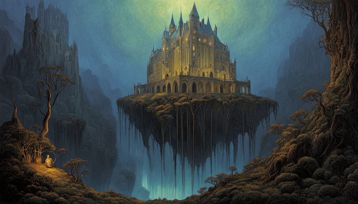 A gothic art image of a stone head adorned with many flowers behind a veil. The artwork features dynamic and volumetric lighting, rendered as a detailed digital illustration with a steampunk aesthetic.