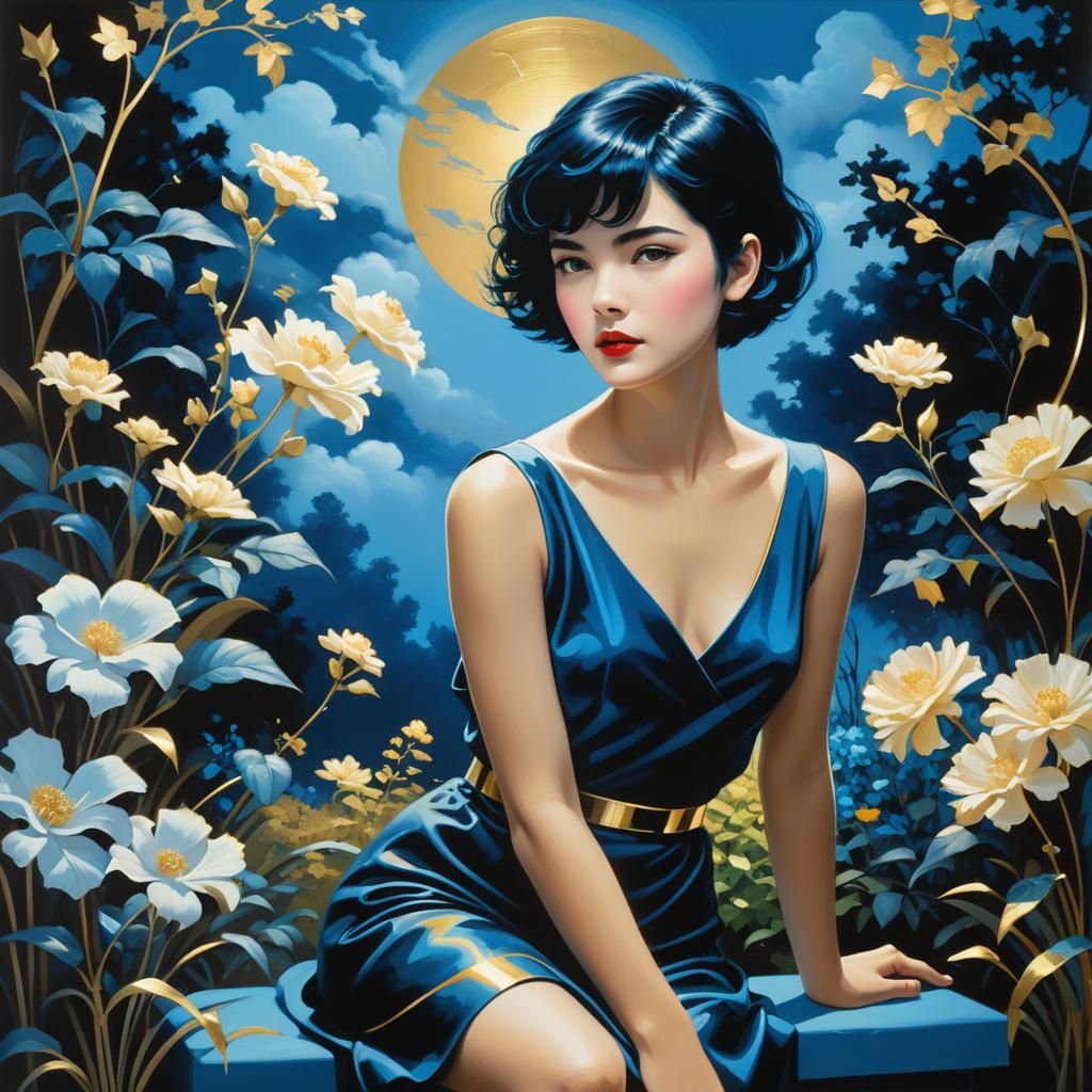 This image shows a pretty modern noir woman with short black hair, posing elegantly in a garden. The image is reminiscent of nostalgic paintings with a dreamy, electric aesthetic.
