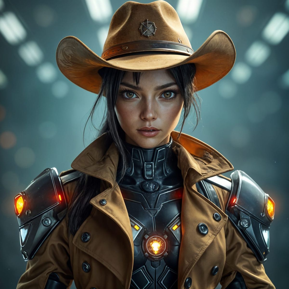 This image depicts a space cowgirl wearing a trenchcoat and cowboy hat with Gundam armor and glowing accents. It's a photorealistic, highly detailed, ultra-high-resolution digital artwork.